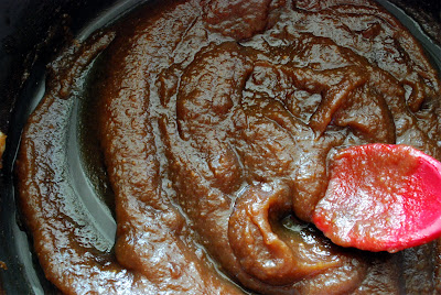 We had seen the table (and an accompanying sign that said "Free Apples") a few other times, but there had never been any available bounty. This time, however, the table was full of apples. These apples were the kind that you don't see at the grocery store; they had bumps and bruises and lopsided parts. Nevertheless we stuffed our pockets full and snagged as many as we could hold in our hands and headed home.It didn't take me long to know what I would do with my new found bounty. I was talking about it before we even reached our front porch. I would make apple butter, loaded with spices and sugar and just delicious. By 2:00 the next day, I had two beautiful jars of apple butter to put away in the pantry, and one container in the refrigerator to eat immediately.